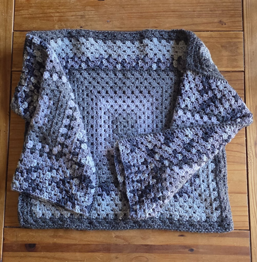 This made me so proud. First time making a sweater and it was really easy. Just big granny squares stitched together.